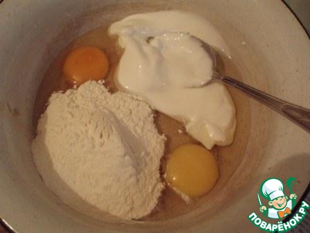 Тем временем смешать яйца, сметану и муку.