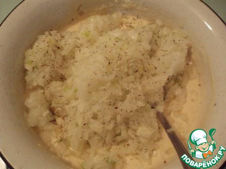 Слить воду с лука, хорошо его отжать и добавить к яично-сметанной смеси. Посолить, поперчить, добавить сахар и все хорошо перемешать.