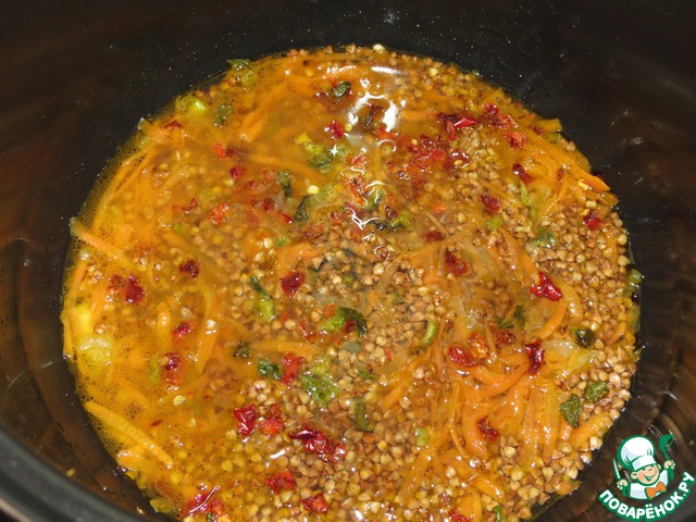 Добавить промытую гречку, паприку, сушеные помидоры, соль, воду.