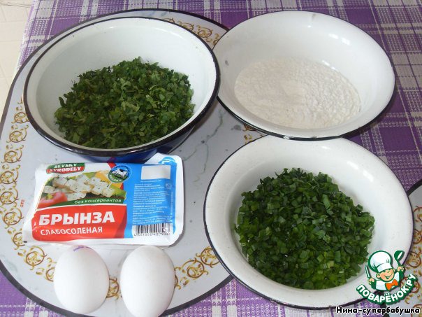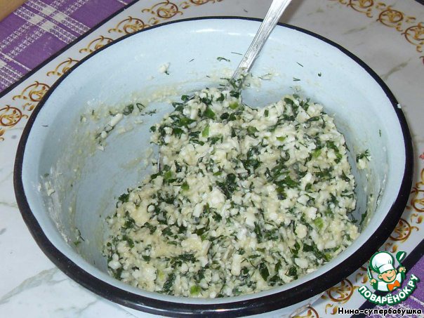 Зеленый лук, петрушку и немного зелени кинзы, если есть, она придает аромат и очень хорошо сочетается с брынзой - все это мелко нарезать и слегка спассеровать на растительном масле. 200 г брынзы натереть на крупной терке, потом хорошенько растереть, добавить зелень, яйца, муку, перемешать.