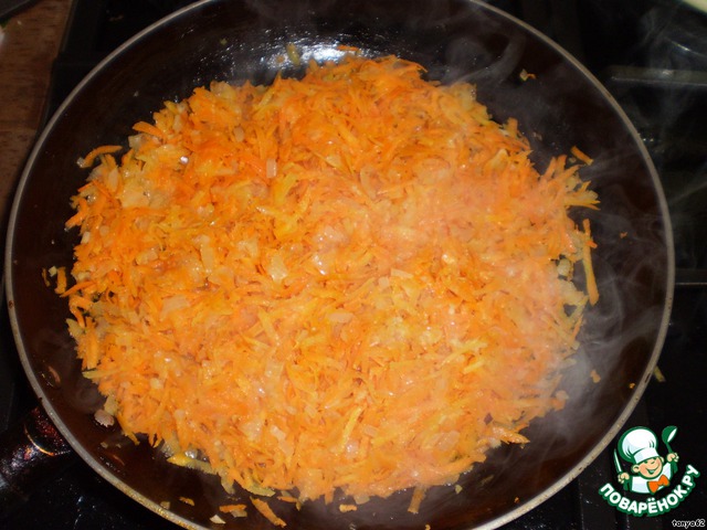 В сковороду налить масло, обжарить сразу чеснок. Затем положить лук и морковь. На медленном огне обжарить, до готовности.