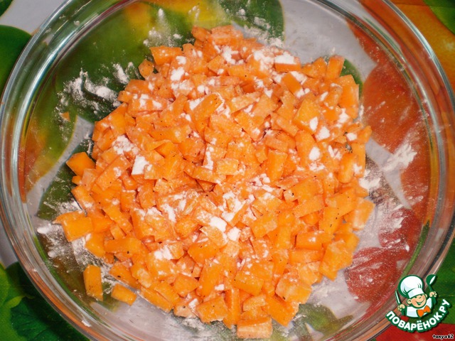 Тыкву положить в миску, посолить, поперчить по вкусу. Посыпать мукой и перемешать все.