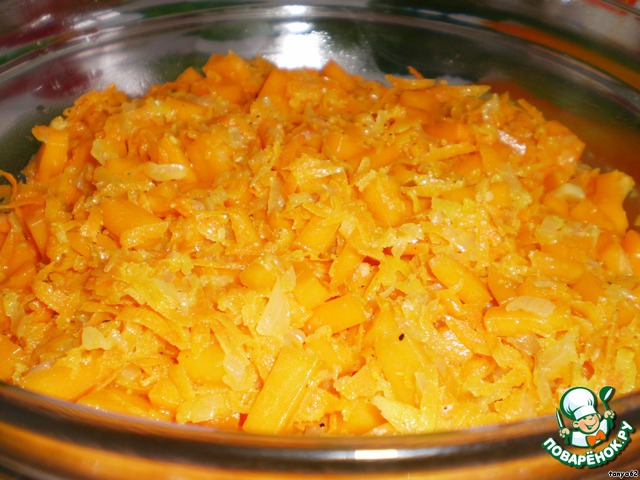 Нарезать тыкву маленькими кубиками, мелко порезать лук, натереть на крупной терке морковь.