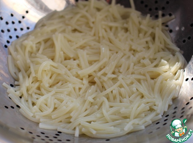 Пока капуста тушится, сварить вермишель в соответствии с инструкцией, слить воду.