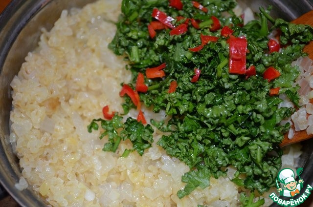 Добавить к булгуру вяленые томаты, чили, зелень,