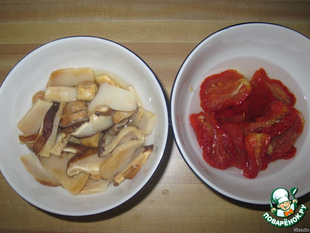 Грибы положить в миску и залить 350 мл воды. Помидоры положить в другую миску и залить оставшейся водой. Оставить на 20 минут.
