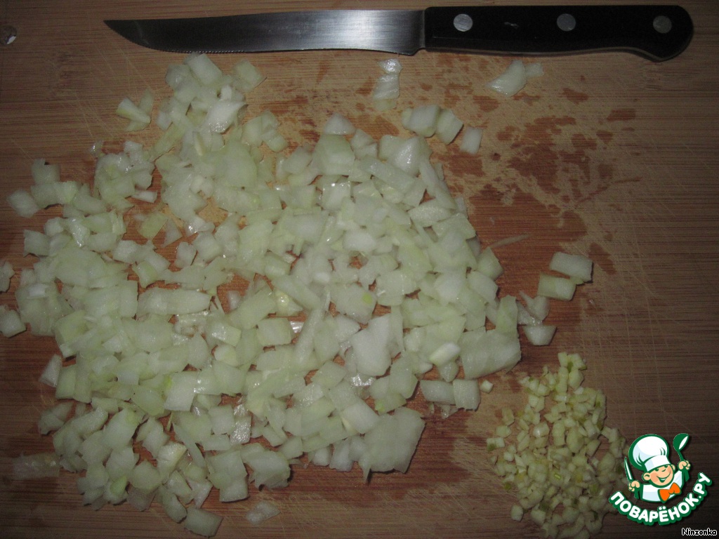 Тем временем мелко режем лук и чеснок.