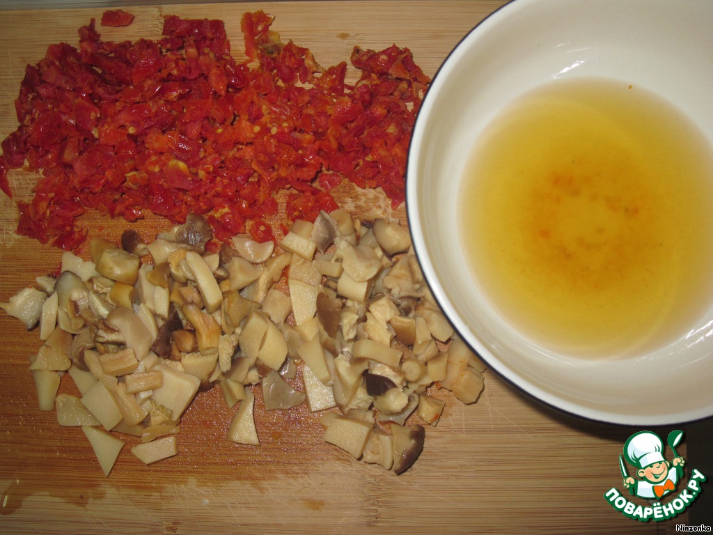 Через 20 минут вынимаем грибы и помидоры, не очень мелко режем. Воду сливаем в одну миску.