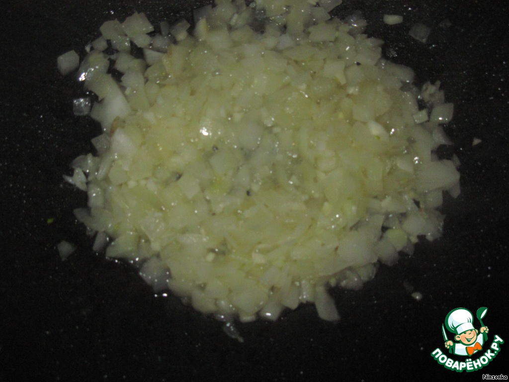 На сковороду наливаем оливковое масло и 3 столовые ложки жидкости из под грибов и помидоров. Кладем лук и чеснок и тушим до слегка золотистого цвета.