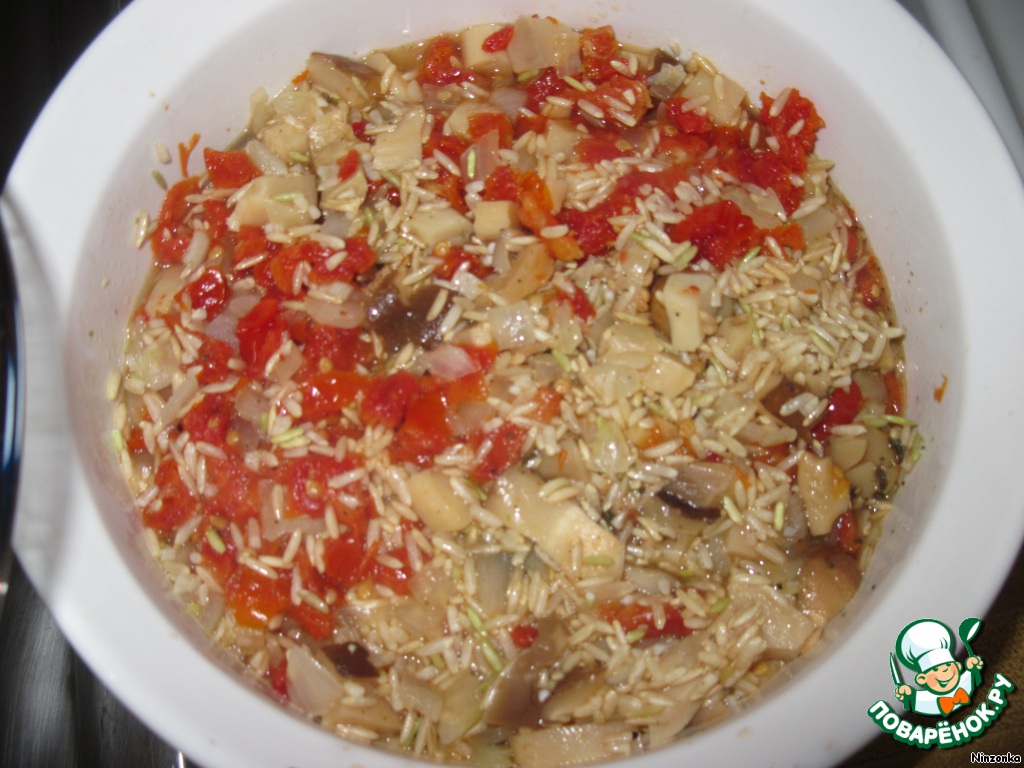 Перекладываем в форму для запекания и ставим в разогретую духовку 180С (350) примерно на 40 минут (до готовности риса).