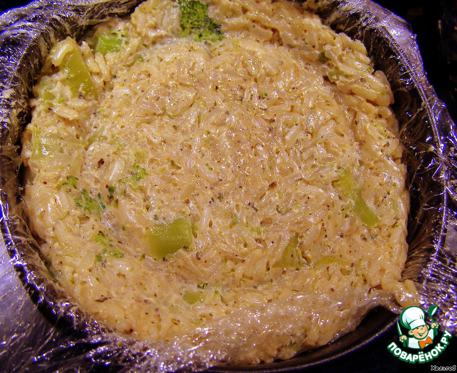 Форму для риса проложить пленкой и наполнить смесью и придавить для лучшего сохранения формы. Остудить.