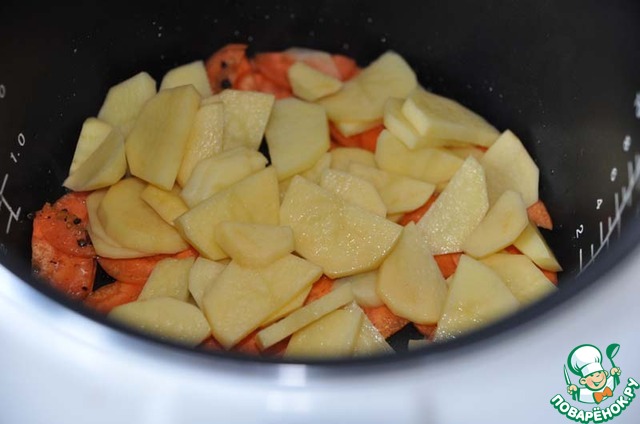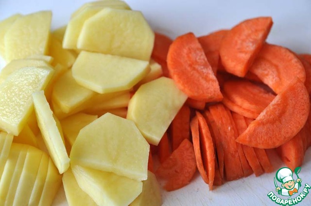 Картофель и морковь чистим, нарезаем тонкими полукольцами.