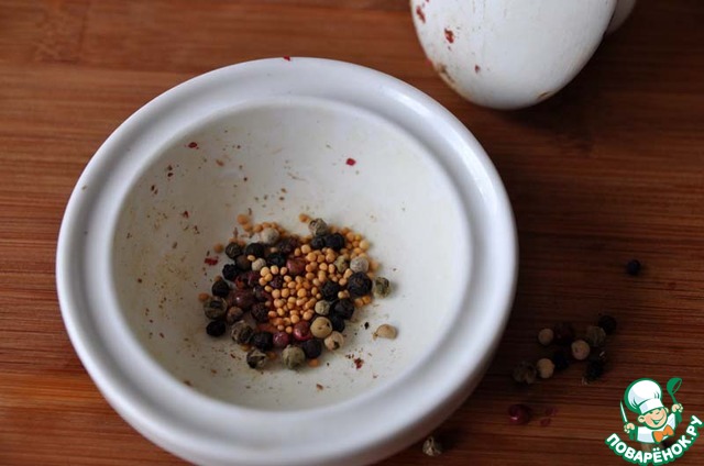 Смесь перцев и семена горчицы измельчаем в ступке.