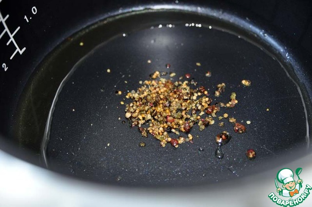 Высыпаем в масло смесь перцев и горчичного семени и обжариваем до появления аромата (1 минуту)