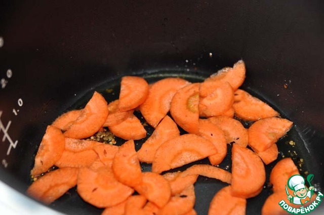 Кладём в чашу морковь и обжариваем 1 минуту.