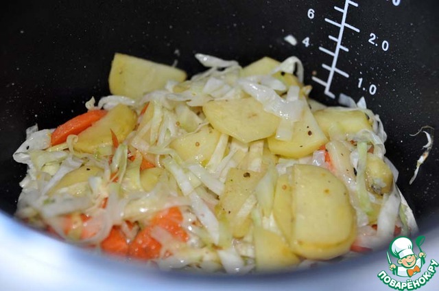 Добавляем капусту, перемешиваем, жарим ещё 2 минуты.