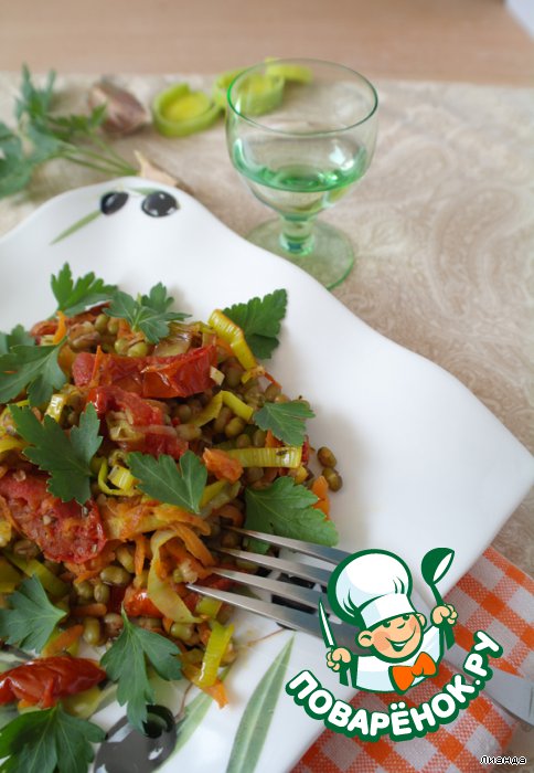 В сковороду налейте растительное масло, обжарьте на нем лук и чеснок, через пару минут добавьте морковь. Еще через несколько минут положите в сковороду вяленые помидоры. Посолите, поперчите и всыпьте щепотку прованских трав. Через минутку добавьте бобы маша, прогрейте.