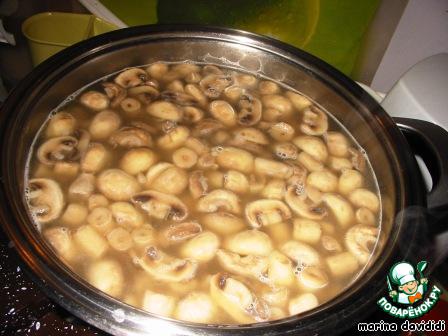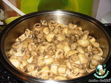 Когда масло растопилось, добавляем грибы и на большом огне, перемешивая, тушим примерно 5 мин. до полуготовности