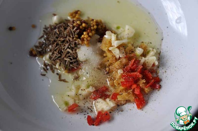 В миску наливаем подсолнечное масло "Идеал", добавляем нарезанные чеснок, имбирь, красный жгучий перец, горчицу с зёрнами, свежемолотый чёрный перец, зиру и соль. Всё перемешиваем.