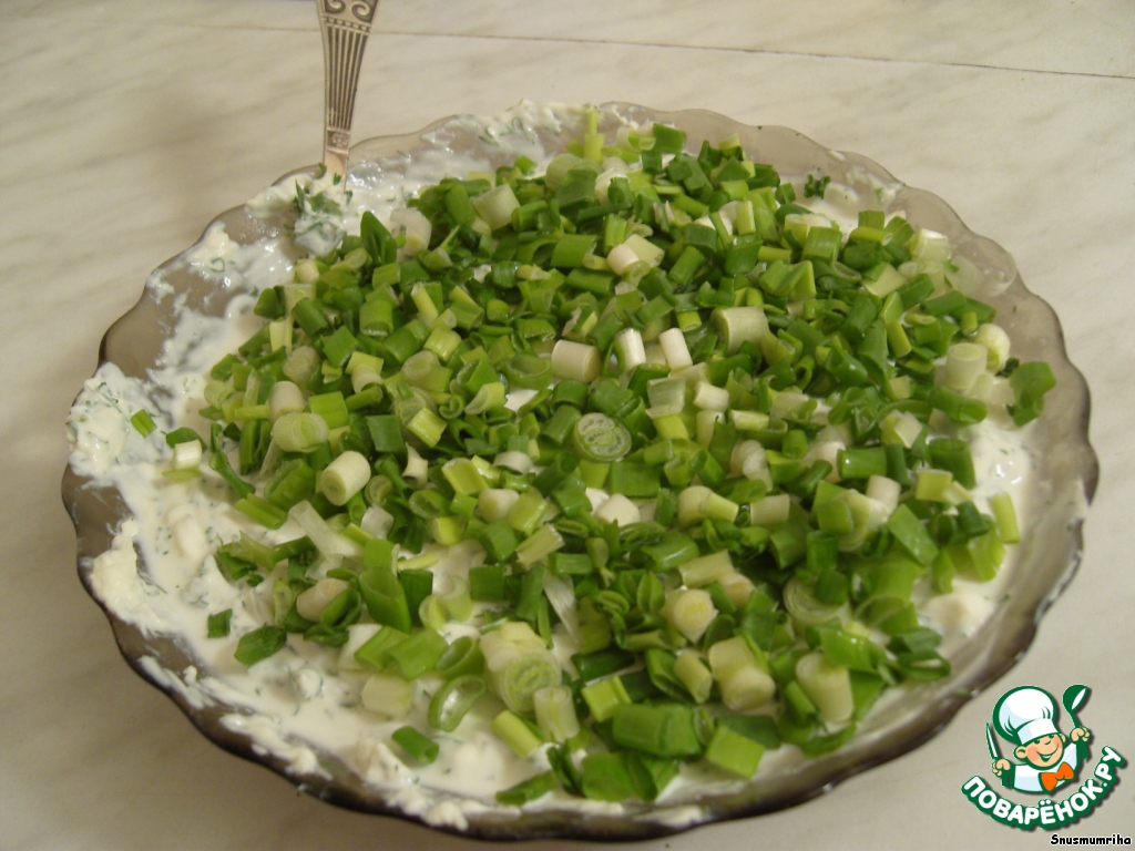 Смешиваем в глубокой тарелке зелень, лук и брынзу.