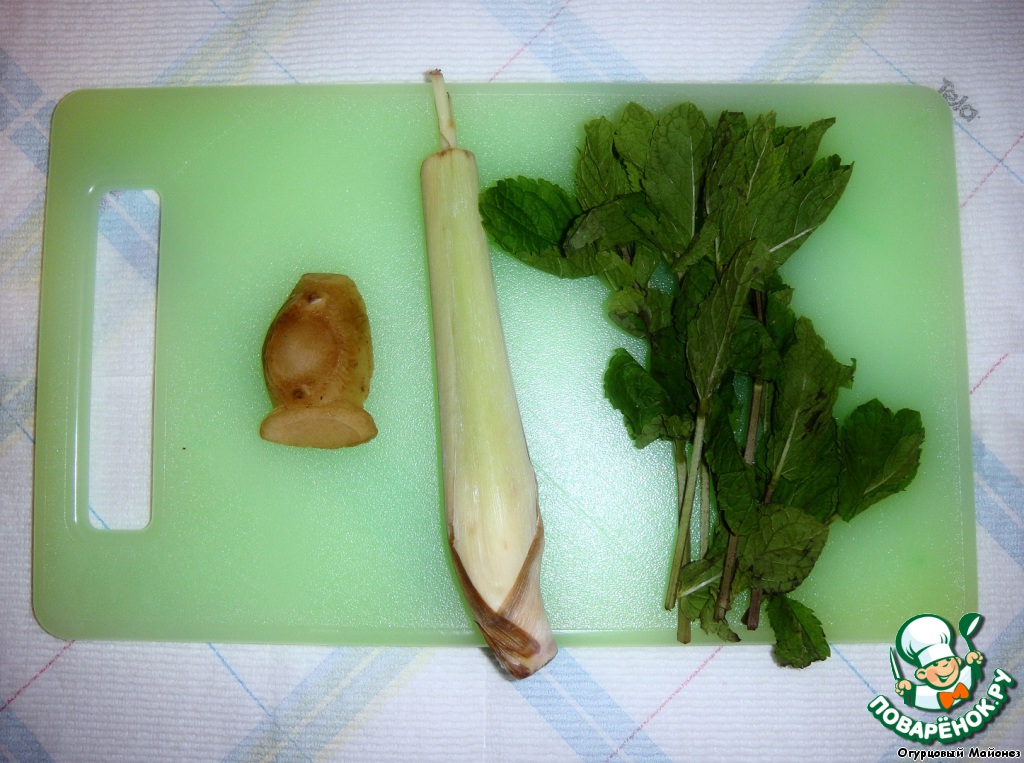 Нарезаем цитронеллу колечками, имбирь режем ломтиками, а мяту рубим (но не очень мелко). Правда, похоже на лук, картофель и петрушку? Не верьте!