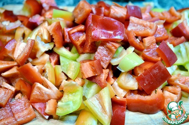 Перцы помыть, очистить от семян и нарезать кусочками 2 см на 2 см.