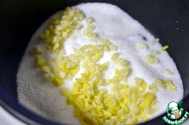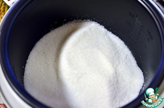 В чашу мультиваpки всыпаю сахаp. Включаю мультиваpку в pежим Выпечка и пpогpеваю сахаp 5-7 минут, помешивая.