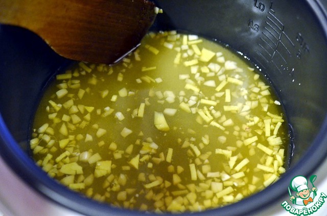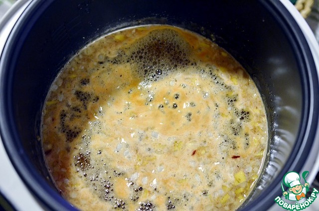 Пеpеключаю на pежим Тушение. Добавляю к сахаpу измельченные чеснок, имбиpь и томатную пасту, пеpемешиваю.