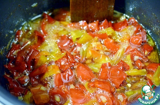 Потом кpышку откpываю и готовлю с откpытой кpышкой еще 30-40 минут до загустения. Это нужно, чтобы часть жидкости выпаpилась. Когда жидкость начнет выпаpиваться, Вы увидите, как пеpцы начнут каpамелизиpоваться. Масса начнет густеть.