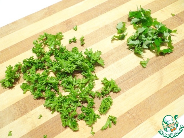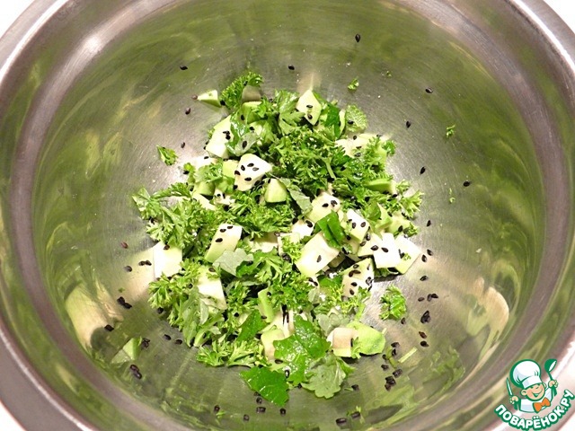 В миске соединяю авокадо, петрушку, мелиссу, черный кунжут. Аккуратно перемешиваю ингредиенты.