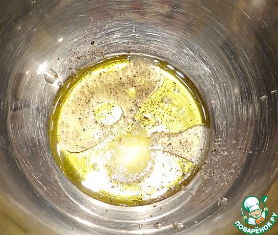 В другой миске готовлю заправку для салата - соединяю оливковое масло, перец черный молотый, соль, лимонный сок. Ингредиенты перемешиваю.