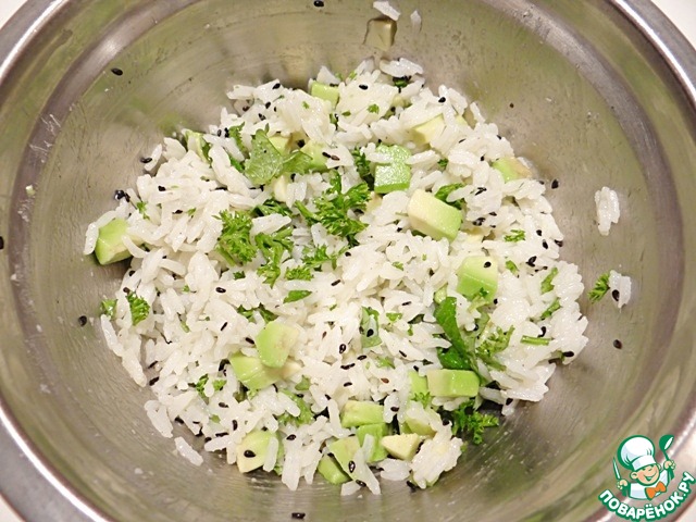 Рисовый салат с авокадо, черным кунжутом и мелиссой