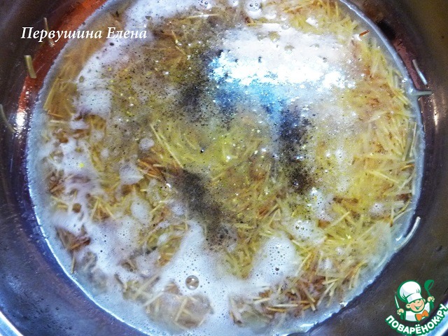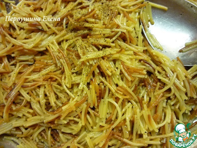 Залить вермишель кипятком, чтобы вода покрывала ее примерно на 1-1,5 см. Посолить, поперчить и
