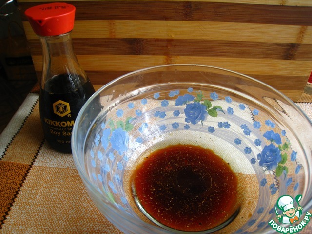 Смешайте масло, соевый соус "Киккоман", 2 ст. л. воды, лимонный сок и мед. Вылейте в сотейник и нагрейте маринад, но не доводите его до кипения. Достаточно довести до 80 градусов.