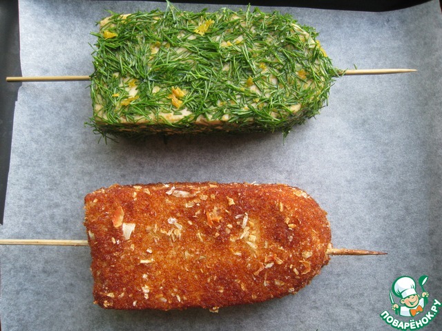Сыр насадить на шпажку (не обязательно) и обвалять один кусок сыра в зелени, а другой - в панировке "Барбекю".