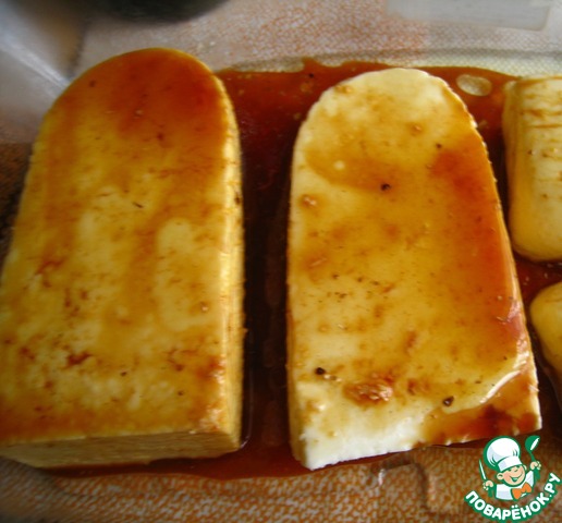 Залила маринадом, затянула пленкой и оставила в холодильнике на 12 часов (желательно хотя бы раз перевернуть). Длительное маринование необходимо из-за плотной и однородной структуры сыра.