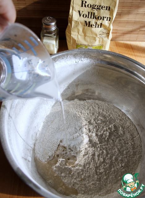 Смешать ржаную муку с солью и постепенно добавить воду комнатной температуры, замешивая гладкое тесто.