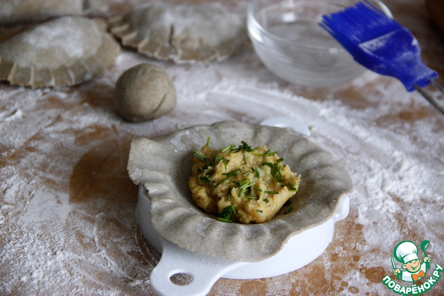 От теста отрываем кусочки, величиной с грецкий орех, тонко раскатываем, выкладываем в форму для вареников, сверху - начинку и немного зелёного лука. Края смазать влажной кисточкой, смоченной в воде.