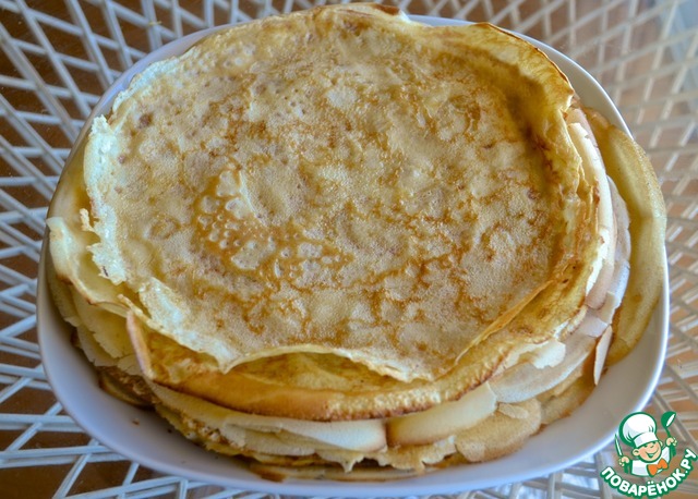 6. Кисточкой смазывать горячую сковороду растительным маслом, выливать по пол-половника теста и раскатывать блинчик тонким слоем, наклоняя сковороду. Готовить одну минуту, перевернуть и готовить еще минуту. На этой стадии блины не должны быть слишком румяными, потому что они будут жариться с начинкой.