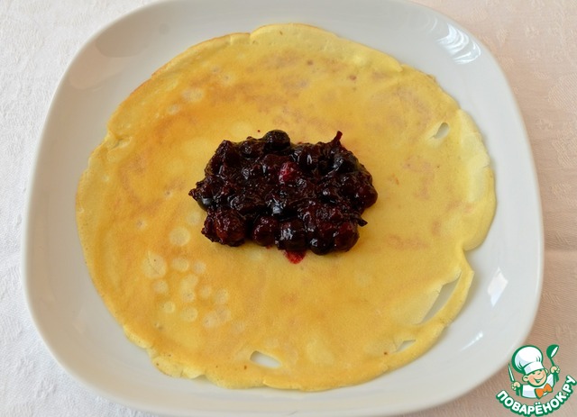 7. Выложить начинку на блин и завернуть его конвертиком. Обжарить в растительном масле с обеих сторон.