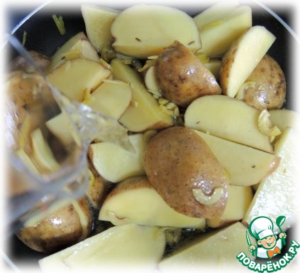 Помещаем картофель в сковороду и слегка обжариваем. Затем вливаем воду. На быстром огне доводим воду до кипения. После этого накрываем крышкой и тушим на среднем огне 15-20 минут.