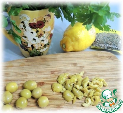 Если оливки с косточками, то удаляем косточки, затем мелко их режем.