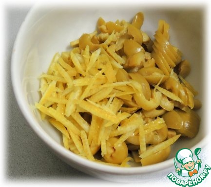 Режем цедру мелкой соломкой, соединяем с оливками.