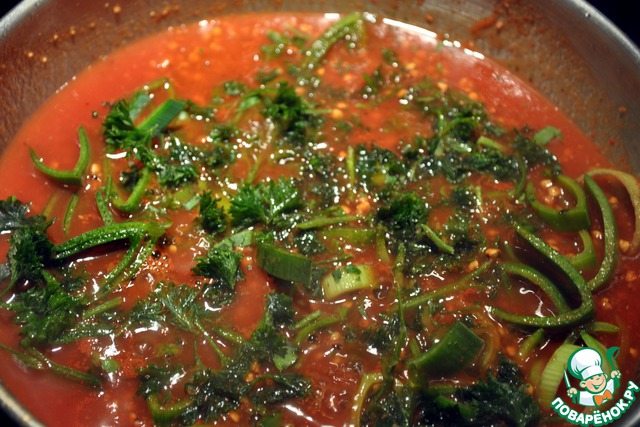 Заливаем томатным соком и кладем мелко нарезанные травы (у меня лук-порей, петрушка и чеснок) в оригинальном рецепте - прованские травы. Закрываем крышкой, варим на маленьком огне, и гречка доходит до готовности.