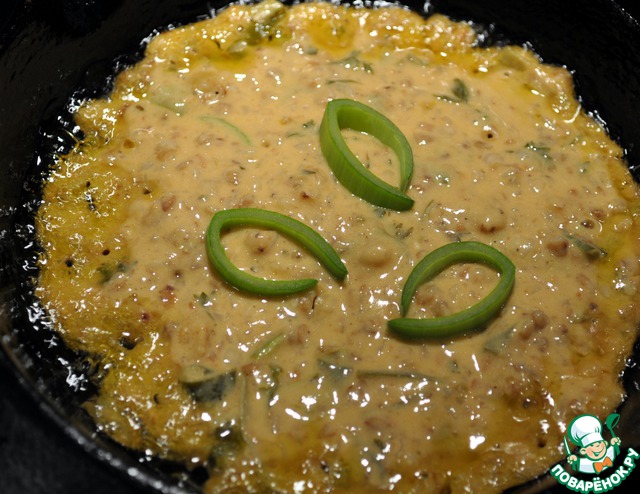 Муку, яйца, майонез, сахар, тертый сыр, пекарский порошок и отварную гречку с травами хорошо взбиваем до однородной массы. Добавляем минеральной воды с газом, если масса получилась очень крутой.