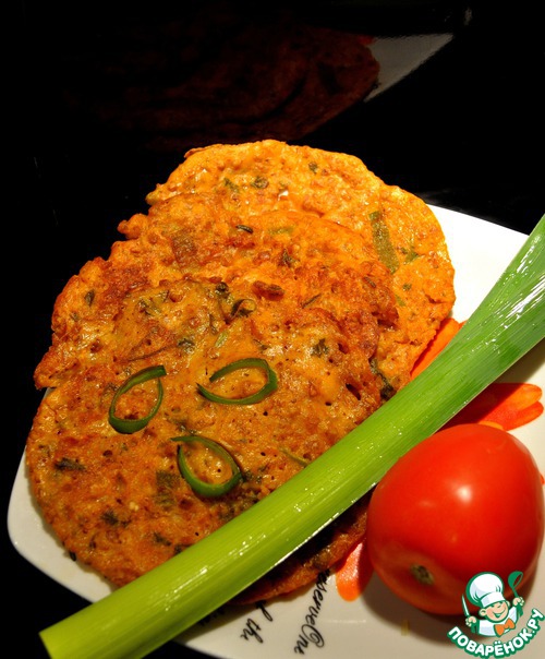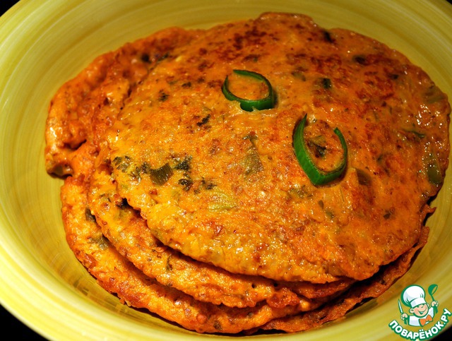 Выпекаем оладушки обычным способом на оливковом масле, я еще добавляла резаный лук-порей на каждый оладушек.