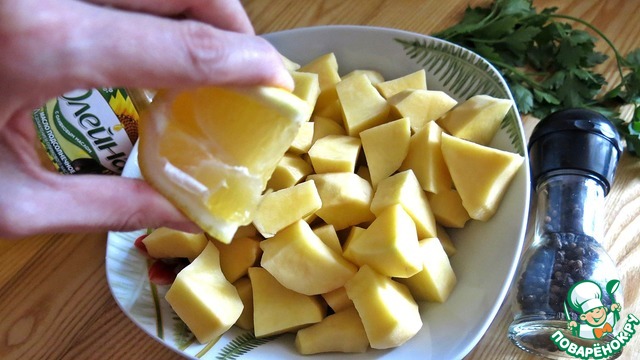 Картофель, перемешивая, сбрызгиваем лимонным соком (если крупный лимон, то 1/4 лимона, если небольшой, то 1/3).