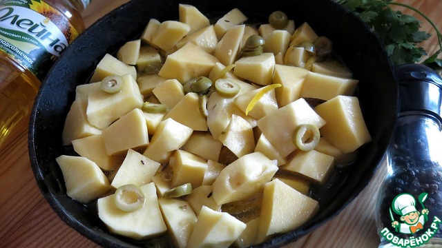 Выкладываем картофель в сковороду и заливаем лимонно-оливковой заправкой.