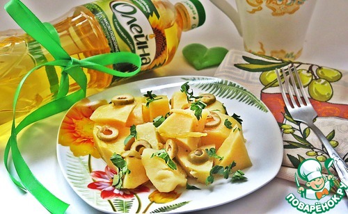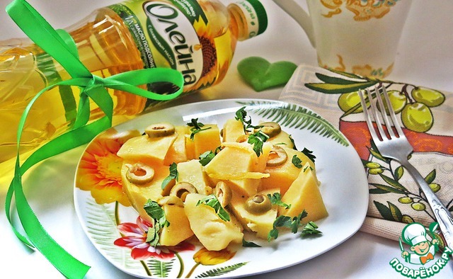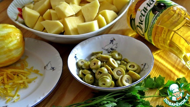 С лимона аккуратно снимаем цедру. Картофель крупно режем. Маслины нарезаем кружочками.