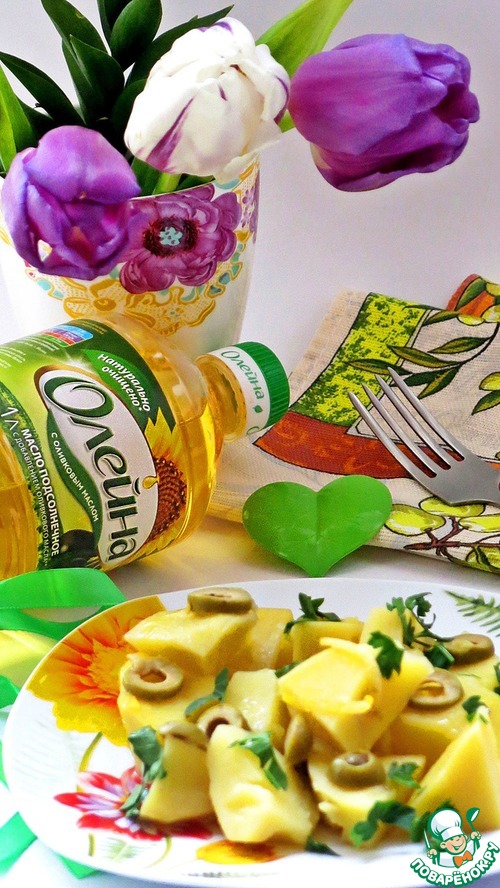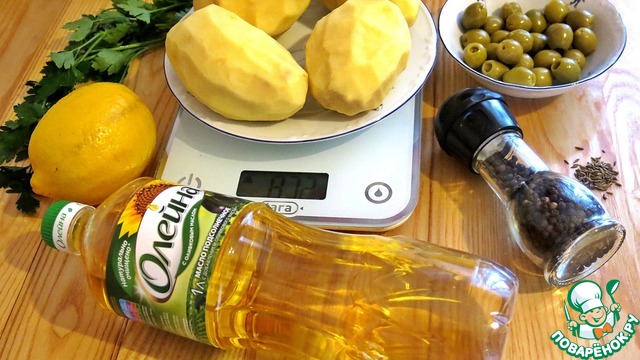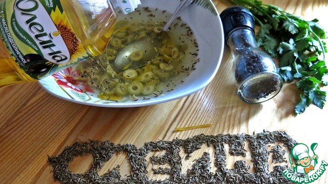 Приготовим заправку, в которой будет тушиться картофель. Смешиваем вместе оливки, цедру лимона, кумин, воду, соль, перец и масло. Т. к. оливковое масло, продукт довольно дорогой, я использую подсолнечное с добавлением оливкового от ТМ "Олейна".
